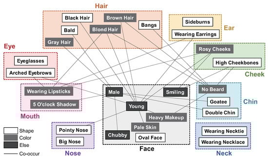 (i) Commonality of facial parts—For face attribute labels, the most obvious relationship is based on the organs, that is, the facial parts included in the face. For example, Black Hair (9) and Wavy Hair (34) are attributes related to “hair,” Arched Eyebrows (2) and Narrow Eyes (24) are attributes related to “eyes,” and Big Nose (8) and Pointy Nose (28) are attributes related to “nose.” Note that the attribute labels such as Male (21), Attractive (3), and Young (40) are assigned to “face” in Figure 2, since they are based on the features of the entire face.