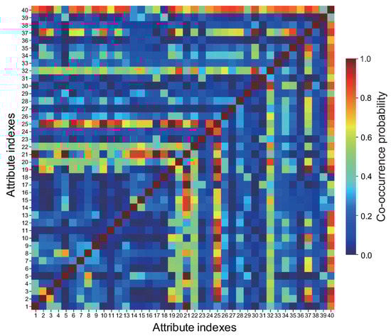 Color map visualizing the co-occurrence probabilities of 40 face attributes in CelebA.