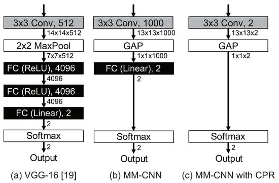 Configuration of CNN classifiers for two-class classification: (a) VGG-16 [], (b) MM-CNN, and (c) MM-CNN with CPR.