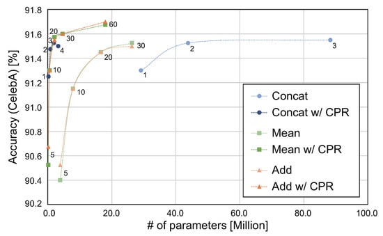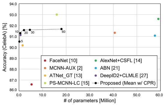 In CelebA, the accuracy of MCNN-AUX [] and MM-CNN (Mean, , CPR) is comparable, while the number of parameters of MM-CNN is 1/70 that of MCNN-AUX. Comparing ATNet_GT [] and MM-CNN (Mean, , CPR), MM-CNN (Mean, , CPR) has 1% higher accuracy and 1/3 of the number of parameters. The accuracy of PS-MCNN-LC [] and AlexNet + CSFL [] is higher than MM-CNN, while the number of parameters of MM-CNN with CPR is much smaller than those of them. As mentioned above, MM-CNN exhibited the best parameter efficiency among the compared methods. In addition, since MM-CNN is a network architecture for multi-task processing, the architecture and CPR of MM-CNN can be used in combination with multi-label methods such as concatenating multiple attribute labels.
