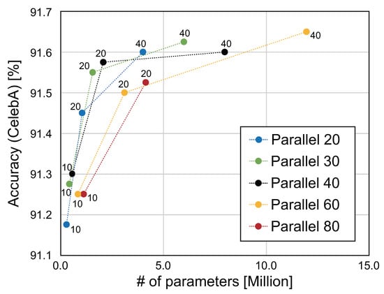 As mentioned in Section 4.1. MM-CNN consists of the combination of single-task CNNs. Although the number of single-task CNNs in MM-CNN is set to 40, which is the same as the number of face attributes, the number of parallel networks can be changed. Through this experiment, we verify the number of parallels with high parameter efficiency in MM-CNN. Note that regardless of the number of parallels, the network architecture from Conv5 to FC in Figure 4b is not changed to output 40 scores. The accuracy of face attribute estimation for CelebA and the number of parameters when changing the number of parallels and c are summarized in Table 6 and Figure 8, where we use Mean and CPR for all the settings. Note that “N/A” in Table 6 indicates that attribute estimation is not performed, since the maximum memory size of the GPU is exceeded. The parameter efficiency for MM-CNN with 20 and 30 parallels is almost the same as 40 parallels. The above results indicate that the performance of MM-CNN can be maximized with a simple criterion that the number of parallels of MM-CNN is set to be the same as the number of face attributes. On the other hand, the parameter efficiency becomes lower for MM-CNNs with more than 60 parallels. In MM-CNN with Mean and Add, the feature maps extracted from each convolution block are added in each channel. As the number of parallels increases, the information is compressed by the addition of feature maps, resulting in a decrease in estimation accuracy. The estimation accuracy in MM-CNN with Concat will also be reduced, since the next convolution block after merging compresses the information in a similar way.