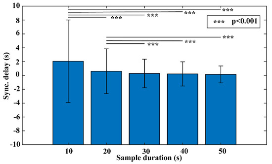 The duration of Lead I sample directly affects the efficiency of the time–synchronization algorithm, i.e., the shorter the sample duration needed, the faster the algorithm can compute, the less computing resource is required, and the greater the convenience for users to collect the data. However, its impact on the algorithm performance is unknown. There might exist a balancing point between efficiency and performance for the choice of sample duration. Therefore, the experiment is designed to use different sample durations for Lead I samples and probe the corresponding performance of the algorithm. The sample durations being tested range from 10 s to 50 s with an increment of 10 s. All choices are confined to under one minute to make the algorithm more practically manageable to end-users. For each choice of sample durations, a matched set of Lead V2 samples is created by extracting an additional 60 s of signals in Lead V2, as described in Section 2.2. The time alignment algorithm is applied to all five sample groups to derive corresponding sync delays. The algorithm performance is compared across different groups, and one duration is determined with consideration of both algorithm efficiency and performance for the subsequent experiments. The analysis of variance (ANOVA) test is adopted to test whether there is a significant difference in the algorithm performance across the five groups. A post hoc Tukey’s HSD (honestly significant difference) test is then performed for pairwise comparisons among sample groups. The significant level is set at 0.05 for all statistical tests in the study.