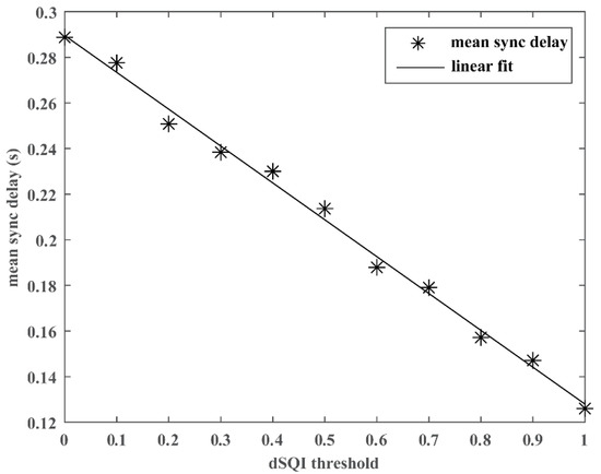 Table 1 summarizes the algorithm performance in sync delay when integrating various SQI thresholds to remove samples with relatively poor signal quality. It shows that the performance consistently improves as a more stringent SQI threshold is implemented. The mean sync delay drops from 0.29 s with an SQI threshold of 0 (i.e., no SQI filtering) to 0.13 s with an SQI threshold of 1 (i.e., retaining perfect quality samples). As shown in Figure 2, the Pearson correlation analysis shows that the performance strongly correlates with the SQI threshold with a statistical significance (correlation coefficient r = −0.997, p < 0.001). It is worth noting that even with the strictest SQI threshold at 1, there are still 43% of samples fulfilling the criteria. The following three experiments are carried out with a fixed SQI threshold set at 1.
