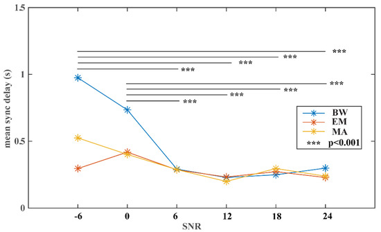 Figure 3 depicts the changing profiles of performance along with varying noise levels in the signal for the three common noise types (i.e., BW, EM, and MA). It presents a generally decreasing trend in mean sync delay with increasing SNRs of the signal across all noise types, indicating that the algorithm suffers from performance loss when noise is present in the signal. Since two key factors exist with respect to the signal noise, i.e., the noise type and the noise level, a two-way ANOVA test can reveal whether there is a significant interaction between the two independent variables. The test result shows that there is a significant interaction effect between the noise type and the noise level (F = 3.51, p < 0.001). The follow-up simple main effects tests show that there exists a significant association between the noise type and the algorithm performance (F = 4.49, p < 0.05), and there is a much stronger association between the noise level and the algorithm performance (F = 13.99, p < 0.001). As also shown in Figure 3, there exists a pivotal signal quality level, with SNRs lower than 6 leading to significantly worse sync delays than higher ones (Tukey’s HSD test, p < 0.001) and no significant difference in the performance when SNRs are higher (including) than 6. When comparing different noise types, pairwise comparisons with Tukey’s HSD test show a statistical difference in performance only between the BW noise and the EM noise (p < 0.05).