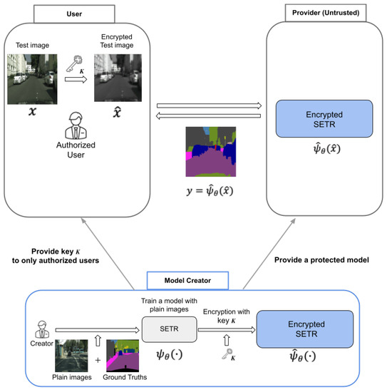 First, a model creator trains a model with plain images. Next, after training, the model is encrypted with a secret key K as . Then, key K is provided to authorized users, and the protected model is provided to a provider, who has no key. Then, the users encrypt query (input) images with key K to protect sensitive information included in the images and send the encrypted ones to the server. Finally, the users receive segmentation maps from the server. The main purpose of this work is to protect sensitive information of the input images the users have. The proposed method can be carried out without both any performance degradation and network modification, compared with the use of plain images.