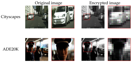 Example of encrypted images (). Zoom-ins of red-framed regions are shown on right side of each image. The red boxes represent sensitive information such as license plates.