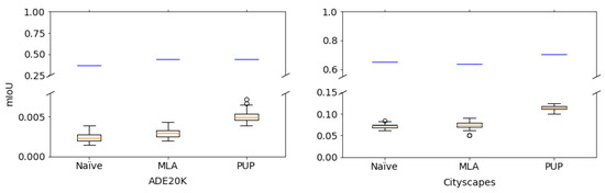 Mean IoU () values of protected models with randomly generated 50 keys. Boxes span from first to third quartile, referred to as and , and whiskers show maximum and minimum values in range of []. Band inside box indicates median. Outliers are indicated as dots. Blue lines represent each baseline.