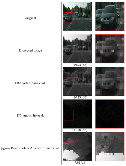Examples of images restored from encrypted ones, see [26,34,35,36]. Zoom-ins of red-framed regions are shown on right side of each image. The red boxes represent sensitive information such as license plates. PSNR values are given under images.
