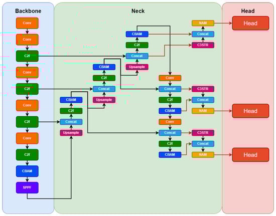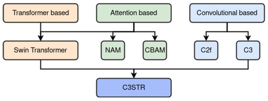 Overview of the modules and mechanisms’ hierarchy proposed in this study to enhance the performance of YOLOv8. Here, NAM stands for Normalized Attention Module, while CBAM refers to Convolutional Block Attention Module. Further, C2f is a fast implementation of the Cross-Stage Partial (CSP) Bottleneck with 2 convolutions, while C3 indicates a CSP Bottleneck with 3 convolutions. Finally, C3STR refers to the integration of the Swin Transformer Block in place of the C3 module’s Bottleneck.