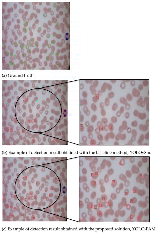 When evaluated on MP-IDB, YOLO-PAM consistently outperformed existing methods across all four parasite species. Notably, within the P.f. class, YOLO-PAM achieved a remarkable Average Precision (AP) of 83.6%, surpassing both the baseline YOLOv8m and the previously established state-of-the-art detection method [44]. Similarly, in the P.m. and P.o. categories, YOLO-PAM exhibited high performance, demonstrating its precision in detecting parasites of varying sizes within these species.
