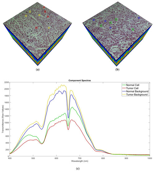 Hyperspectral tissue samples dataset. (a) Tumor (hepatocellular carcinoma, HCC) tissue sample, tumor cells (red), tumor background tissue (yellow); (b) Normal (Healthy) tissue sample, normal cells (green), normal background tissue (blue); (c) Spectra comparison plotting of the given components.