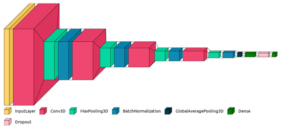 Mathematically, 3D kernels can be formulated as in Equation (1), where represents the value at position () in the feature map in the layer, is the index value of the input feature maps from the layer connected to the current feature map, , and are the height, width, and depth of the kernel, respectively, is the kernel value at position () for feature map in the previous layer, is the bias, and is the activation function.