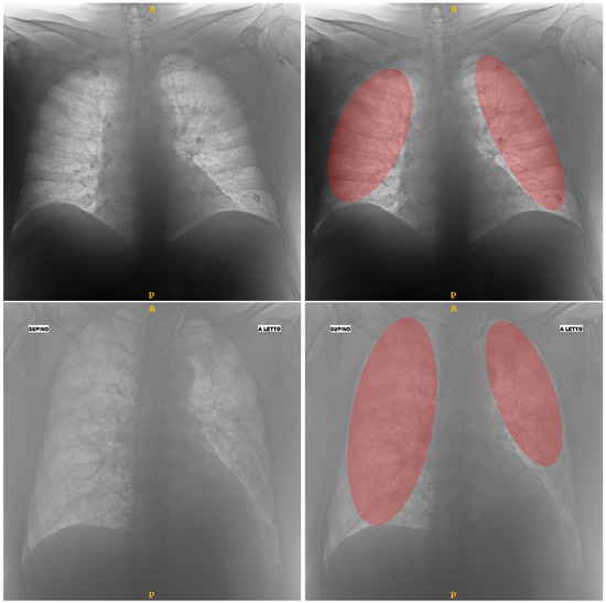 To extract the radiomic features, the regions of interest (ROIs) containing the lungs have to be identified. To achieve this, a MATLAB®-coded custom tool was implemented to delineate the lung ROIs: in particular, a semi-automatic delineation modality for the identifying of the maximum elliptical ROI contained within the lung was implemented. This choice was motivated by the need to focus the attention on the central region of the lung, excluding peripheral zones. In Figure 1 two segmentation examples. Due to the excessive heterogeneity of the CXR dataset, automatic lung segmentation approaches did not provide satisfactory results. For this reason, it was decided to implement a tool that can easily support clinicians during the image annotation procedure. Specifically, the implemented semi-automatic algorithm allows the automatic identification of the bounding-box containing the lung and determining the maximum elliptical ROI contained within it. The clinician can decide whether to accept it, if the result is satisfactory, or to modify it to find a more suitable fitting between the elliptic ROI and the lung area by changing orientation and size of the ellipse. Because this is a supervised semi-automatic approach (each segmentation is directly validated), and considering the experience of the clinicians who supported this study, no evaluation step was performed. We decided to implement an ad hoc computer-assisted tool that can simply and intuitively guide clinicians through the steps of lung segmentation, from CXR image selection to segmentation mask storage.