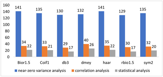 Upper: Selected features after near-zero variance analysis (in blue), correlation analysis (in orange), and statistical analysis (in gray), respectively. Lower: Selected features considering each wavelet decomposition.