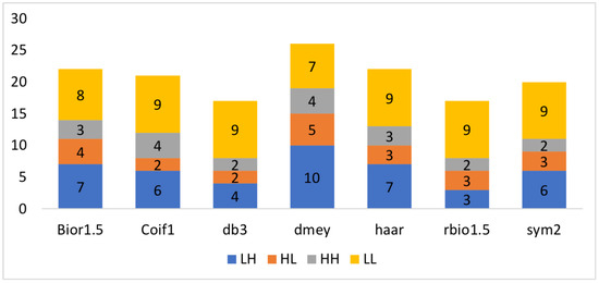 Moreover, each ROI was filtered considering all families of the wavelet transforms discussed above. Specifically, for each image and for each wavelet family, four decompositions (, , , and ) were calculated, and then the features were extracted by obtaining a total of features. Finally, the original radiomic features (without wavelet filtering) were also extracted to compare the wavelet-derived vs. original predictive capabilities.