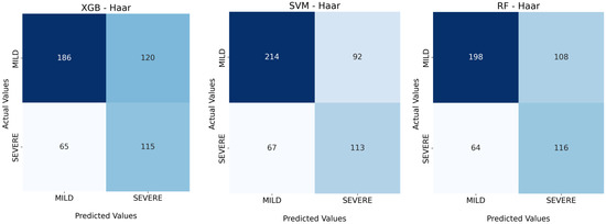 Figure 3, shows the confusion matrices obtained by the three ML classifiers considering Haar as the wavelet kernel.