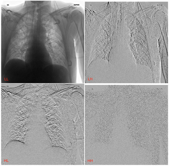 The widespread use of wavelet transforms—used in several applications concerning signal and image processing—is due to their ability to capture information in both the frequency and time domains. In this study, discrete wavelet transform (DWT) was applied to CXR images. The image passed through high-pass and low-pass filtering operations, decomposing the images into high-frequency (details) and low-frequency components (approximation). The decomposition of the image into subimages at different resolution allows for multi-resolution analysis [18,19]. For this reason, DWT has found numerous applications in image processing, focusing on denoising [20] and compression [21,22]. DWT is computed through two functions, the scaling function and the wavelet function[23]. For a 2D signal of size (such as the CXR images considered in this study), the DWT is defined as: