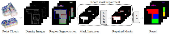 To solve these problems, this paper proposes a novel method to automatically generate fine scene plans from indoor 3D point clouds. The method, proposed in this paper, discards the excessive use of geometric priors and complex geometric optimization by using deep learning instead of traditional methods to obtain a regular and accurate interior geometric layout, and uses optimization algorithms to compensate only for those details that cannot be handled by deep learning. Using deep-learning methods instead of traditional optimization algorithms achieves the highest possible operational efficiency while improving accuracy and precision. Firstly, the method segments the density map into several irregular mask instances using the Mask-RCNN (Region based Convolutional Neural Network) method [10], where each mask instance represents a room. Second, a GAN-based neural network was designed to refine each individual irregular room mask instance to obtain a clear and accurate structure. Finally, by optimizing room boundaries with a layout constraint, this paper generates a tight and accurate room floorplan for the density map. The main contributions of this study are as follows: