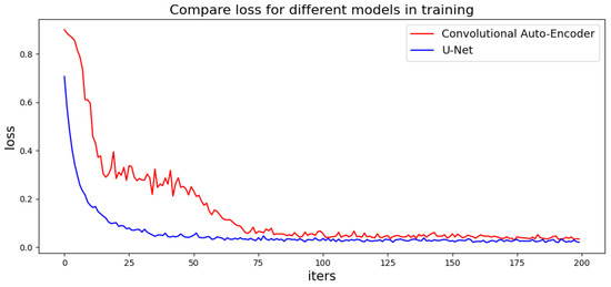 Traditional GAN-based models use a convolutional auto-encoder as the generator, which has an encoder and a decoder. However, the convolutional auto-encoder loses a lot of information during the encoding and decoding process, making it difficult for training. Here, this paper employed a U-Net [28] structure model with attention mechanisms to build a generation network. U-Net consists of two parts: an encoder and a decoder. The encoder on the left side extracts the features of the image, and the decoder on the right side connects the encoder with the same layer. U-Net up-samples four times, and each time it executes a skip connection, which allows the decoder to retain as much of the original information as possible. Those connections can obtain more accurate multi-scale edge information of the generated images. Figure 3 compares the loss of the U-Net-based generator with the original Convolutional Auto-Encoder in the training stage, where the U-Net-based method exhibits a lower and smoother loss curve. For mask image generation, instead of using original GAN, this paper employed WGAN with Wasserstein distance to measure the difference between the artificial data distribution and real data distribution. The adversarial loss function and the discriminator loss function are defined as