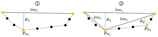 Therefore, this paper used a keypoint detection algorithm to obtain keypoints from the repaired masks for room edge extraction. As shown in Figure 4, the algorithm takes two points to obtain a line, and calculate the farthest point to the line between the two points. If the farthest point is less than the threshold farthest point (the keypoint), the algorithm take the keypoint as the midpoint to obtain two lines, then repeat the previous steps until no keypoints are generated. Finally, the algorithm connects the keypoints to obtain edges.