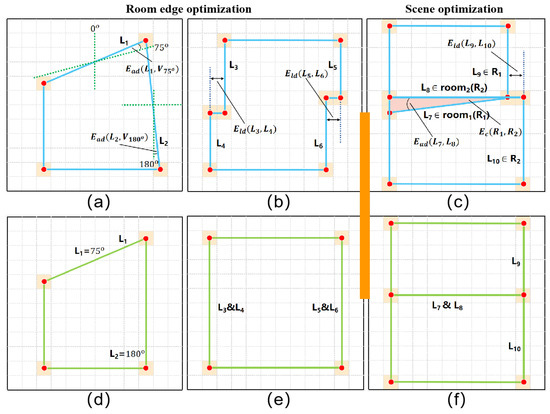 After optimizing each single room, this paper used the location information of bounding boxes to place the reconstructed room back to the corresponding positions in the floor map for an overall optimization. As shown in Figure 5c, a slight overlap and dislocation exists between neighboring room instances. Therefore, this paper added another energy term to penalize the coincidence between each pair of neighboring rooms. Energy item was also added to ensure room integrity. The final energy equation is obtained by