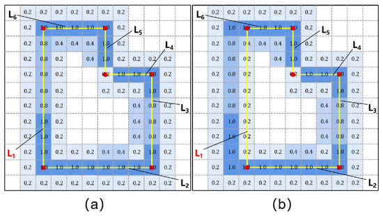 Illustration of the term, which is defined by edge likelihood maps. The energy value is calculated from the pixels that the edge passes through. The energy value in (a) is less than the energy value in (b).