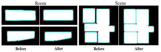 where and are edges of a single room, is a scale vector, and is a binary variable. When the angle between the edge and scale is less than the threshold (., 5), is set to 1, otherwise 0. is the angle deflection between the room edge and each rotation scale. By the same token, is also a binary variable; when two lines are parallel and close, it is set to 1, otherwise 0. is the distance between two edges from a single room.