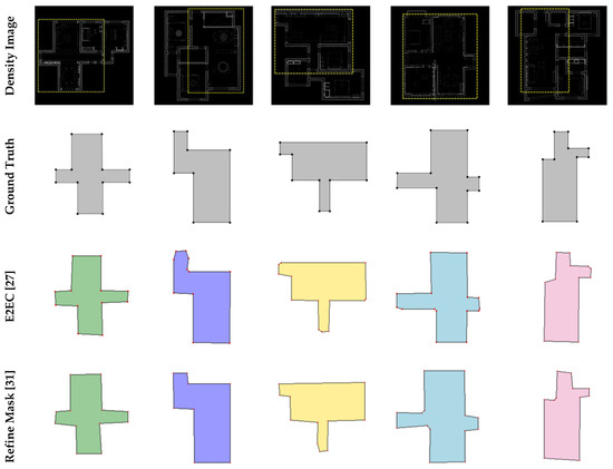 Furthermore, in terms of mask generation, the experiment compared the proposed method (Mask-RCNN+GAN) with the three most advanced methods in the field of instance segmentation, including Mask-RCNN, E2EC, and RefineMask [31]. This paper used vectorization operations on the masks generated by different methods to obtain room plans, and evaluated the precision and recall of the generated corners.