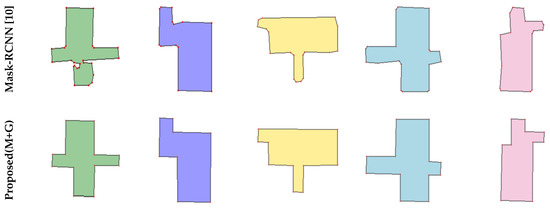 Table 1 shows the results of the comparison between the proposed mask generation method and the other advanced methods. The proposed method achieved the best evaluation result in corner metrics; the precision and recall of corner detection were 0.938 and 0.975, respectively. The precision score of E2EC was high, but the recall score was low, which indicates that E2EC misses many corners in the ground truth. The precision and recall metrics of the other two methods were lower than those of the proposed method, which shows the advantage of the proposed method.