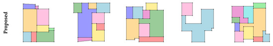 Figure 9 compares the final results obtained by different methods. ASIP can generate rough geometries, but with messy points and edges. Zhang et al.’s algorithm is an improvement over ASIP, but there are still incorrect corner points and edges. As shown in the sixth row of Figure 9, because Floor-SP uses the shortest-path algorithm, it may yield incorrect results in complex non-convex graphics, whereas the proposed method provides a correct result close to the ground truth. MonteFloor gives good results, but there were still some errors in structurally complex regions.