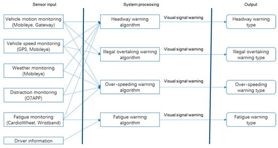 The headway warning uses a forward-facing device such as a radar, Light Detection and Ranging (LiDAR), or a camera, to detect obstacles (e.g., car or pedestrian) in the path of the vehicle in which it is installed [4]. It monitors the distance (i.e., time headway) from the vehicle ahead, to provide alerts when the following time headway is below a pre-defined threshold, to help mitigate rear-end crashes [5]. This assists in significantly improving road traffic, as rear-end crashes are reported to account for more than 30% of crashes involving vehicles [5,6]. Similarly, over-speeding warning, fatigue warning, and illegal overtaking warning, monitor vehicle speeds, driver fatigue statuses, and overtaking maneuvers, respectively. Generally, as in any other ADAS warning, different types of warnings can be triggered once the predetermined thresholds have been exceeded. To the best of the authors’ knowledge, however, there is very limited literature that focuses on the implementation frameworks of these warnings, especially for over-speeding and illegal overtaking. Moreover, any related products in the market commonly use fixed and deterministic warning thresholds for all drivers (regardless of their status). For instance, [7] proposed to use 2.0 s as a cautionary threshold and set 1.5 s as a warning threshold for the visual representation of time headway. Generally, 5 km/h, 10 km/h, 15 km/h, 20 km/h, etc., are widely used as the thresholds for over-speeding warning in the real world or related products. These implementations or products therefore do not consider the impact of contributing factors, including weather, environment, types of vehicles around, risky hours, time of the day, fatigue, distraction, and drowsiness, on the driver operation and the traffic safety. This will occasionally lead to the issuance of annoying inadequate warnings and further reduce the acceptance and the effectiveness levels of ADAS [8].