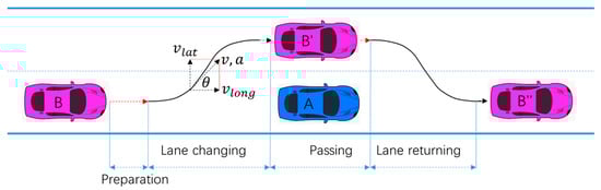 Generally, a reasonable overtaking maneuver includes four phases, i.e., a preparation phase, a lane-changing phase, a passing phase, and a lane-returning phase, similar to the four phases of a car overtaking a cyclist [27]. While previous studies have looked into lane changing behavior, particularly extreme trait behaviors [28] and disordered heterogeneous traffic conditions [29], few if any looked at it as part of an adaptive overtaking warning algorithm. Our proposed real-time illegal overtaking warning algorithm aims to deter drivers from making an illegal overtaking move. The different stages are depicted in Figure 2. Drivers changing their lanes should not influence the vehicles around them; if the vehicles around the driver (i.e., driver A in Figure 2) take actions such as reducing speed, avoiding operation, etc., the overtaking move would not be considered reasonable and safe.