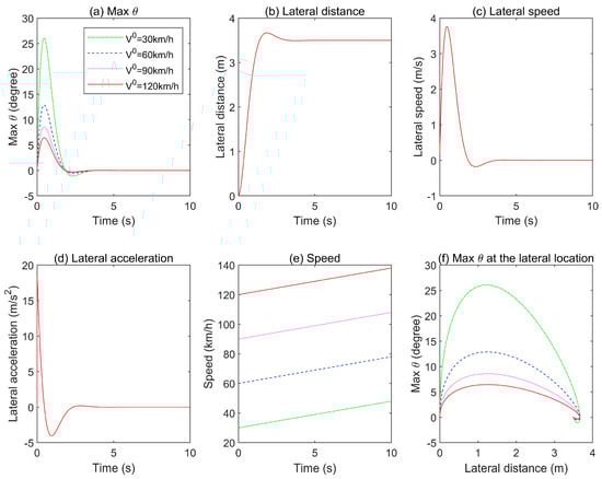 Figure 3 shows the change in max theta, latitudinal variables, and current speeds over time in the lane-changing phases for different initial speeds ( = 0.5 m/s2) (see Equation (5)). It is noted that the color ranking of these curves in Figure 3 is the same with that in Figure 3a. The area between the curves and the x-axis in Figure 3a are the theta values for safe lane changings during the overtaking move. Regarding each lane change in the overtaking maneuver, the safe max theta has to reduce gradually over time or the latitude distance and speeds and can even be negative for a short time. After that, the theta is supposed to tend to zero. In addition, the higher the speed is, the lower the safe max theta is (see Figure 3a,f).