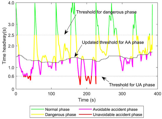 The green, yellow, magenta and red are for the normal phase (headway > 2.5 s), dangerous phase (updated threshold for AA phase < headway ≤ 2.5 s), avoidable accident (AA) phase (0.6 s < headway ≤ updated threshold for AA phase) and unavoidable accident phase (headway ≤ 0.6 s), respectively. We can find that the updated threshold is changing over the occurrence of braking situations between 1.0 s and 2.0 s. The braking action in the dangerous phase will make the threshold lightly bigger in the dangerous phase based on Equation (1) and the bigger is, the bigger the improvement is. On the contrary, the low deceleration action in the avoidable accident phase will make the threshold lightly smaller based on Equation (2) and the bigger is, the bigger the decrease is.