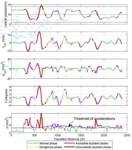 By comparing the lateral velocity () and the heading degree (), we find that their curve tends are the same and that they have the same sign at the same location. The lateral velocity reduces or increases with the decrease or improvement of the heading degree. These two indicators achieve local extreme points (e.g., maximum, minimum, and zero) at the same location. On the contrary, the curve tends of the lateral velocity () and the lateral acceleration () are not the same. The lateral velocity achieves local maximum or minimum values when the lateral acceleration is zero temporarily. According to the lateral position, we can find that there are five overtaking moves in Figure 7. An overtaking move includes a preparation phase, a lane-changing phase, a passing phase, and a lane-returning phase. In the lane-changing phase, the heading degree () and the lateral velocity () firstly starts to reduce until a negative local minimum value, and then increases until around zero. Meanwhile, the lateral acceleration () firstly starts to reduce until a negative local minimum value, and then increases until a positive local maximum value, and then reduces to around zero. In the lane-returning phase, the heading degree () and the lateral velocity () firstly starts to increase until a positive local maximum value, and then increases until around zero. Meanwhile, the lateral acceleration () firstly starts to increase until a positive local maximum value, and then reduces until a negative local minimum value, and then improves to around zero. The start and end of their travelled distances of each overtaking move in Figure 7 are approximately (200 m, 645 m), (645 m, 930 m), (930 m, 1250 m), (1425 m, 1803 m) and (1803 m, 2384 m).