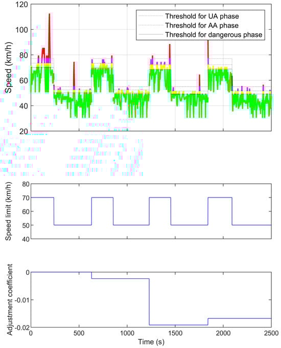 Figure 8 illustrates a test example of the real-time over-speeding warning algorithm. The green, yellow, magenta, and red are for the normal phase (speed < threshold for dangerous phase), dangerous phase (threshold for dangerous phase ≤ speed < threshold for AA phase), avoidable accident (AA) phase (threshold for AA phase ≤ speed < threshold for UA phase) and unavoidable accident (UA) phase (speed ≥ threshold for UA phase), respectively. There are four kinds of driving conditions. They are, successively, a clear condition without the fatigue and distraction (time: 0–630.90 s), a night condition without the fatigue and distraction (time: 630.95–1230.05 s), a rainy night condition with a phone distraction (time: 1230.10–1840.75 s), and a rainy condition with a phone distraction (time: 1840.80–2500 s). According to Table 2, the adjustment coefficients is calculated (see Figure 8) and then the thresholds are updated with the help of the real-time over-speeding warning algorithm. Meanwhile, the speeding warning is provided in real time based on the current speed and thresholds.
