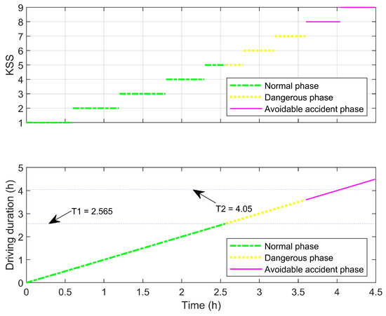 Figure 9 illustrates a test example of the real-time fatigue warning algorithm. The green dashed line, yellow dotted line, and magenta solid line are for the normal phase, dangerous phase, and avoidable accident phase, respectively. The different levels of the fatigue warning are provided in real time with the change in the KSS and driving duration. It is noted that the first and second thresholds of the driving duration are 3 × 0.95 × 0.9 = 2.565 h, 4.5 × 0.9 = 4.05 h, respectively, since this is a non-professional young female driver. Therefore, it is identified as the dangerous phase (yellow) when the driving duration is greater than 2.565 h even though the KSS is still 5. Moreover, it is identified as the avoidable accident phase (magenta) during the 3.6 h and 4.05 h driving duration since the KSS is 8.