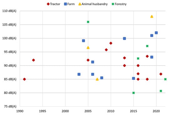Exposures in dB(A) from papers cited in the previous subsections are reported in Figure 2, reported for the corresponding year of observation, showing sources separated by type of activity: tractors, farming activities, animal husbandry, and forestry. Most of the observations fall beyond the threshold level of 85 dB(A), and a change can be observed only for tractor activities as the only category showing a small decrease over time. It should be noted that technical advances in tractors, such as improved cabs and mufflers, have influenced this trend, given that tractors manufactured from the year 2000 on presented noise levels of73 dB(A), which are significantly lower than those of tractors built in previous decades []. Research findings indicate, however, that noise issues can still be present for tractor activities involving workers on foot nearby the tractor or if the vehicle lacks proper maintenance [].