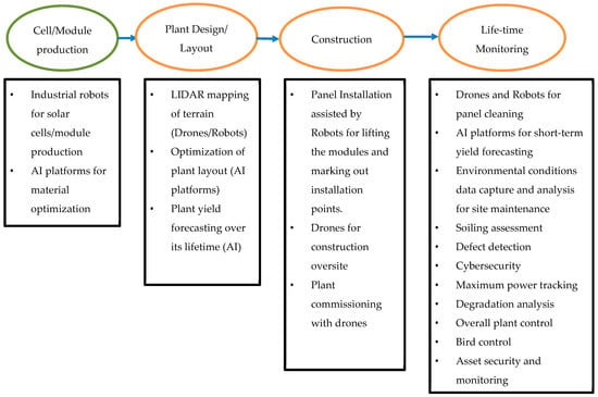 The energy sector encompasses various applications, including smart grids, energy management systems, oil and gas exploration and production, and renewable energy. The renewable energy sector, in particular, continues to develop new applications utilizing robotics, artificial intelligence, and drones to overcome challenges that limit the benefits of renewable energy. It is widely known that renewable energy technologies face several challenges, including the availability of the main energy source for conversion, limited installation space, high energy storage costs, natural disasters, and maintenance issues. To address these challenges, strategies have been developed, such as wind turbine inspection with drones, robotic arms for renewable energy equipment manufacturing, and AI-platforms for energy management. For solar photovoltaic energy generation, drones equipped with sophisticated cameras and AI algorithms can inspect solar panels to detect faults and damages [12,13], enabling timely maintenance and repair. Autonomous robots can clean solar panels [14], and AI can optimize the operation of Solar PV systems [15]. Additionally, machine learning algorithms can analyse data from solar panels, weather forecasts, and energy markets to predict energy production and consumption patterns, allowing for the system’s optimal operation [16,17].