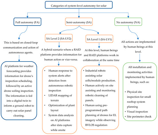 While this classification approach has successfully enabled the current regulatory oversight for on-road motor vehicles, we observe that applying the same principle for Solar PVs may not provide a robust solution. This is because the approach applied above can be considered a single device scenario when compared with the range of interacting systems applicable on a single Solar PV installation/farm. However, since EVs and RAID applications have similarities in terms of the inclusion of autonomous systems, we consider leveraging the basic principles used in the automotive sector. To achieve some form of generalization for RAID applications in solar photovoltaics, we propose consideration of the autonomous processes/applications and the various anticipated failure points/processes. To perform this, we first consider the existing classifications or categorization of the RAID platforms and their applications within the Solar PV sector.