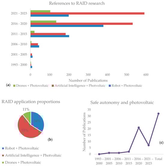 From Web of Science [79]: (a) References to RAID and photovoltaics research; (b) Spread of RAID application; and (c) Reference to safe autonomy.