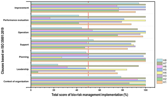 The organizational context, which includes understanding the organization and its context, understanding the needs and expectations of interested parties, and defining the biosafety management system, showed deficiencies in formal documentation across all laboratories. While activities related to biosafety were being practiced, formalization through written standard operating procedures (SOPs) was lacking. Similarly, the leadership clause exhibited notable gaps, especially in policies and roles. Based on the assessment, only three laboratories had specific biosafety-related policies (H1, H4, H7), and those in existence were often general and not tailored to the unique risks associated with biological materials. To establish a laboratory biosafety management system, an organization must be able to develop and enhance the system in place by setting objectives and goals. Commitment should also be fostered by top management through providing adequate resources and prioritizing communication regarding biosafety regulations, incorporating biosafety management into the organizational system, and identifying improvements and prevention related to incidents caused by biological materials [