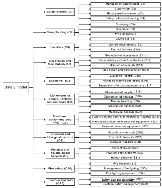 Specifying the criteria and sub-criteria in the safety model was based on several sources; these included the International Labor Organization conventions and recommendations [30,32,34], the safety regulations of the Jordanian labor law [35], the United Kingdom Health and Safety Executive approved codes of practice [11,31,33], and sources from the literature [1,17,18]. In addition, to categorize the criteria, experts in safety training and evaluation were reached according to the modified Delphi method [36].