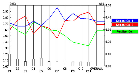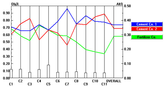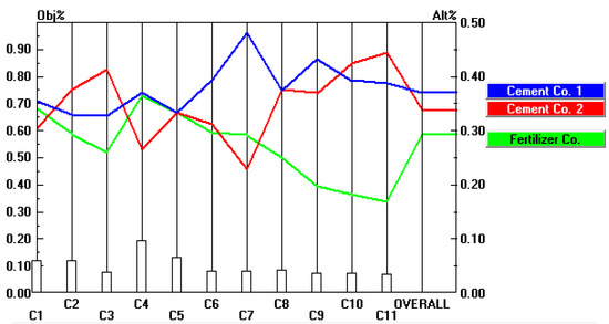 As shown in Figure 5, the safety system (C1) weight was increased by 60% from 0.120 to 0.192. The overall weights of alternatives were changed in the following rank: Cement Company 1 from 0.370 to 0.369, Company 2 from 0.344 to 0.341, and the fertilizer company from 0.286 to 0.290.