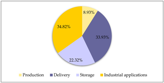 In accordance with the event selection criteria outlined in the methodology section, it is revealed that incidents and accidents with hydrogen involved are most frequent in the context of both industrial uses (34.82%) and delivery processes (33.93%) (Table 4, Figure 1).