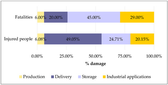 When focusing on the damage, the analysis shows that the delivery phase of the hydrogen value chain accounts for the most injuries (129 from 263, 49.05%), while the storage phase bears the brunt of fatalities (45 from 100, 45.00%) (Table 4, Figure 2).