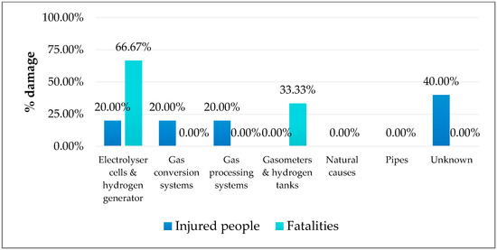 Considering the overall events during this phase, electrolyzer cells and hydrogen generator malfunctions contribute to the most fatalities (66.67%), followed by faults in gasometers and hydrogen tanks (33.33%) (Figure 3). When looking at the fatalities per event for each type of failure, it is important to note that gasometers and hydrogen tanks stand out with a fatality rate of 66.67% (Table 5).