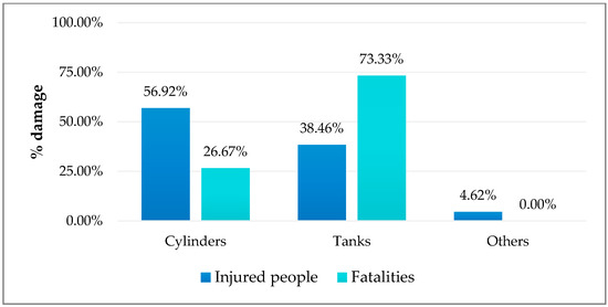 As seen in the previous table, events are related to cylinders and tanks, with a nearly equal occurrence. It is worth noting that problems in tanks are the ones that result in more fatalities (73.33%) (Figure 4), with a fatality rate of 173.68% (Table 7) if we consider the fatalities per number of events in each category. This rate over 100% is an indicator of the risk severity of this type of processes.