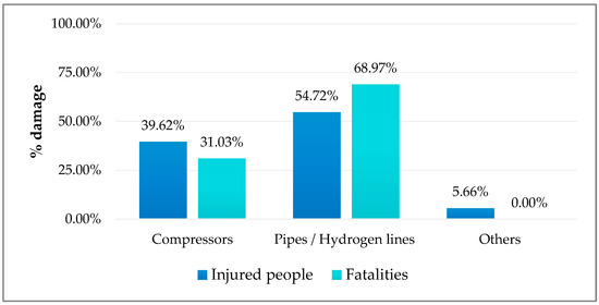 As per the previous table, events related to failures in piping and hydrogen lines are the most prevalent. A majority of the damage is attributed to these events, accounting for 54.72% of injuries and 68.97% of fatalities (Figure 6). However, events associated with compressors, though less frequent, stand out with a higher fatality rate (47.37%) (Table 19).