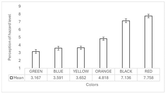 Notably, green received the lowest average rating (M = 3.167) of all the colors, but it did not statistically differ from blue or yellow in terms of ratings. In contrast, red (with an average rating of 7.758) received significantly higher average ratings than all the other colors, except for black, with which it did not show a statistically significant difference. Similarly, blue received a lower perceived hazard mean rating than all the other colors except green, but it did not significantly differ from yellow, with a p-value less than 0.05.